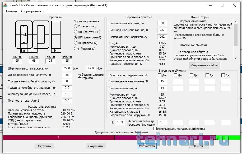 Я не очень разбираюсь в габаритной и потребляемой мощности, в программе я её не ввожу, я ввожу только параметры железа, мне просто нужен 12 вольтовый транс максимальной мощности которую может дать имеющееся железо и провод.Не совсем понял, была габаритная 174 , потребляемая 90
