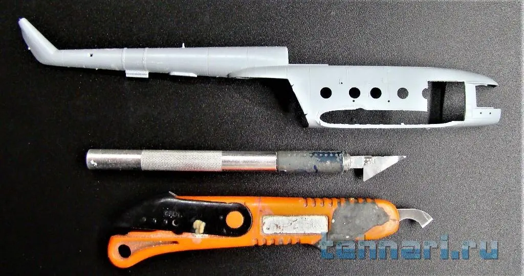 После просушки клея при помощи "Эпоксилина" были сформированы наплывы фюзеляжа на рампу и по окончании полимеризации массы произведена их обработка шкуркой и напильником. Сразу же была изготовлена из обрезков листового пластика откидная крышка для установки пулемета в проеме откидной рампы.