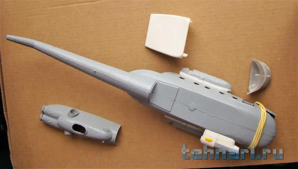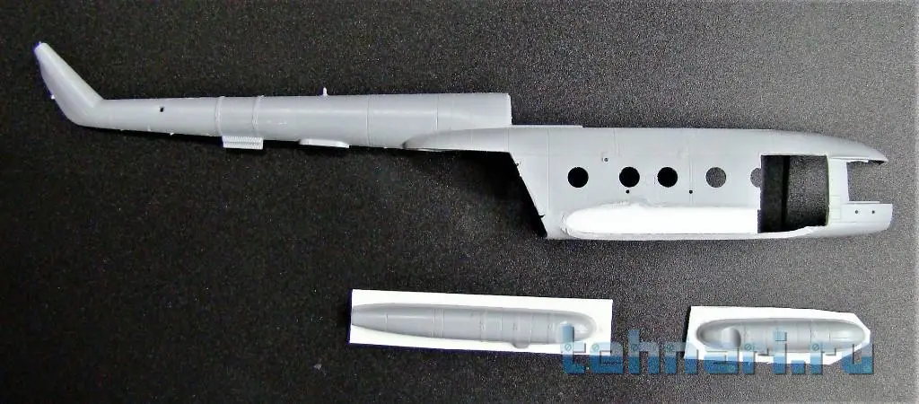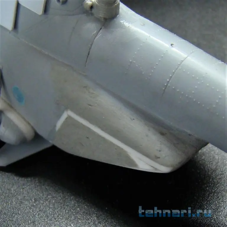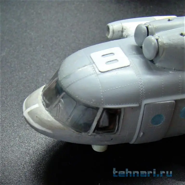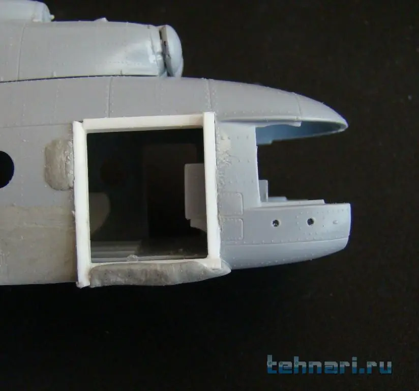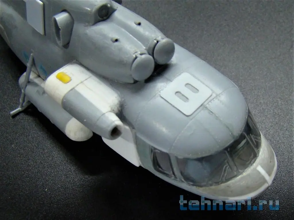 Затем на фюзеляж наклеен капот,закрывающий двигатели и главный редуктор, а также ВСУ. Следующей операцией была приклейка конверсированной задней части фюзеляжа -рампы. И в заключение данного периода работы на место вклеено конверсированное остекление кабины с "дельфиньим" носом.
