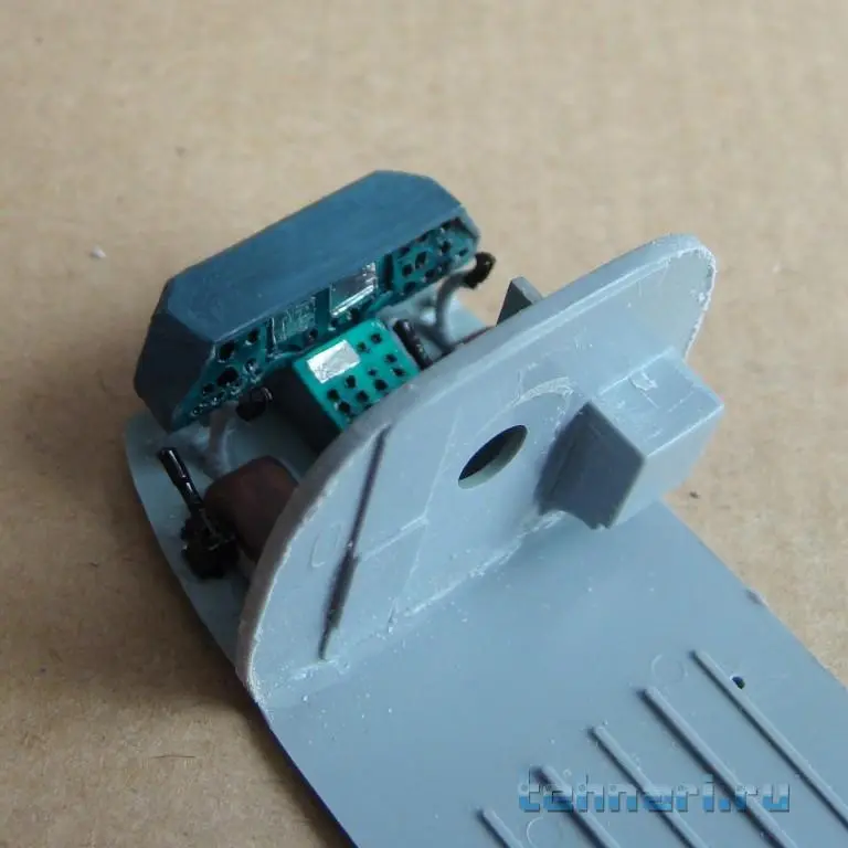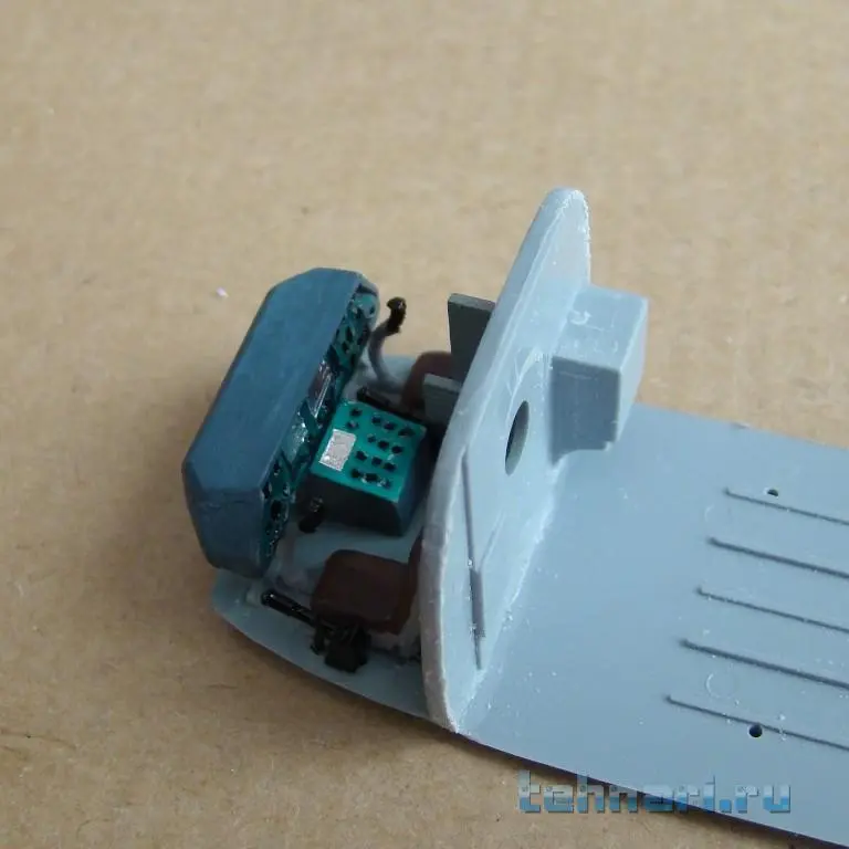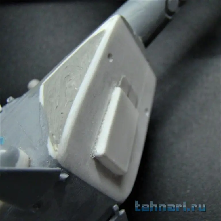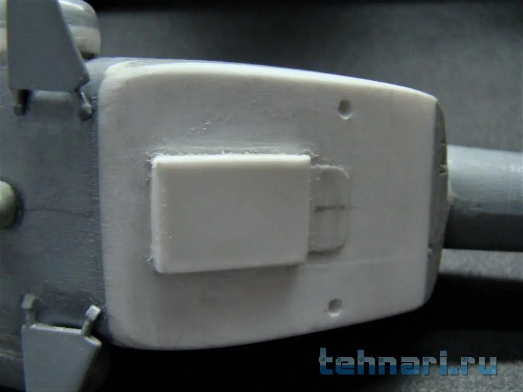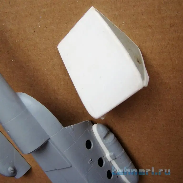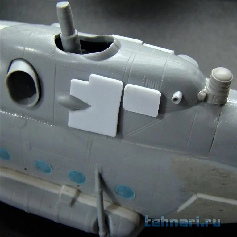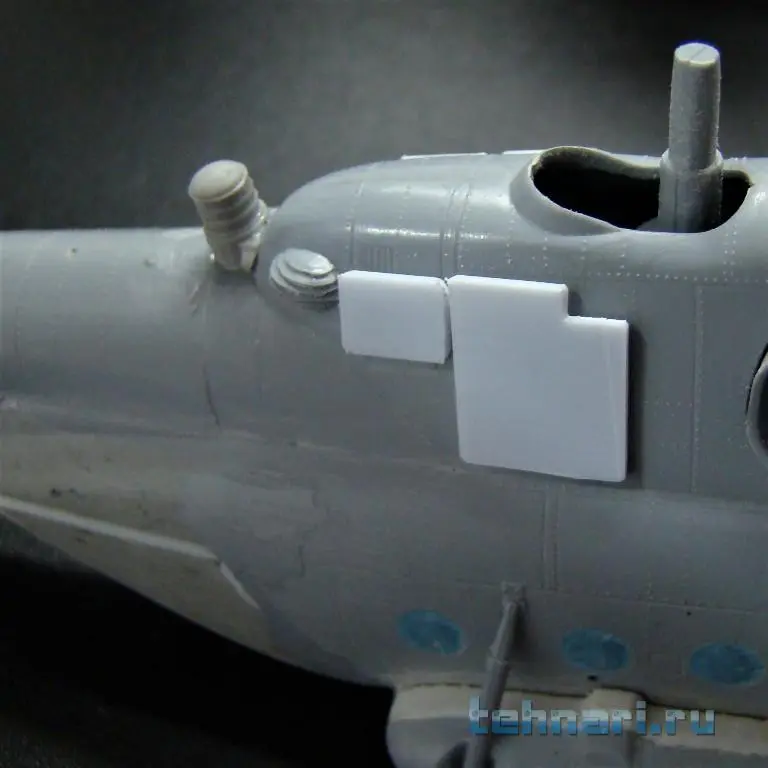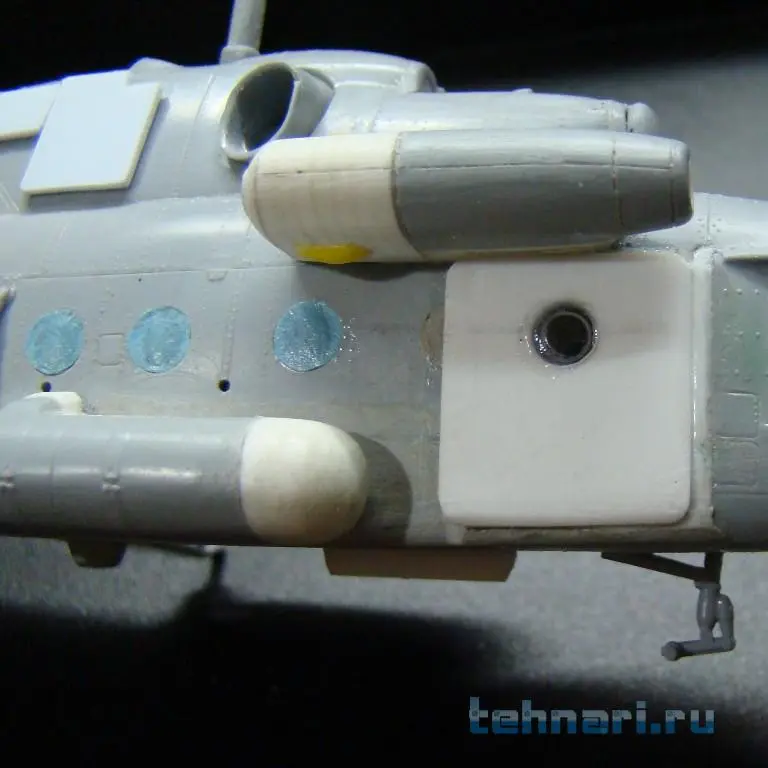 Поскольку данный вертолет предназначен для выполнения штурмовых операций, то помимо защиты кабины пилотов дополнительными бронещитками подобная защита делается и на главный редуктор и ВСУ. Бронещитки вырезаны из листового пластика и установлены на модель согласно фото.