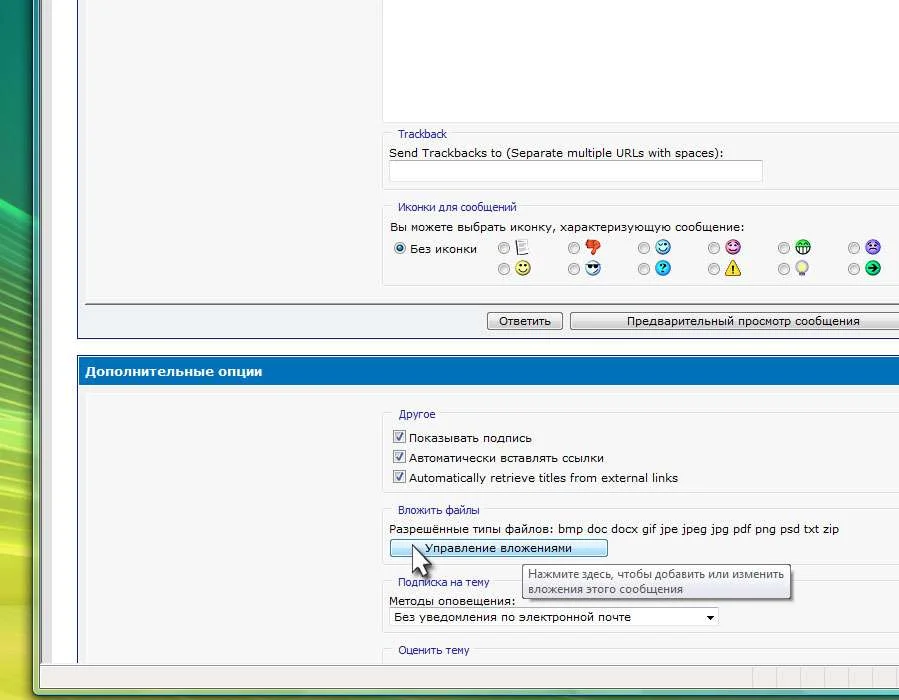 Всего можно загрузить до шести изображений с Вашего вомпьютера. Вложениями могут быть не только изображения, но и другие типы файлов. Их список и максимальный объём можно увидеть в том же далоговом окне. Если Ваше изображение слишком велико по объёму, то советую уменьшить его разрешение в любой графической программе. Оптимальное разрешение для файлов типа .jpg является 600Х800 точек.