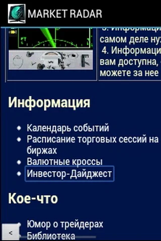 Трейдинг. Биржевой ИнфоРадар - максимум информации при минимуме затраченного времени - вот такой девиз установили разработчики этого приложения для трейдеров, как опытных, так и тех кто только вошел на этот непростой путь биржи. Как знают не по наслышке опытные бойцы рынка форекс, 99 процентов информации там, это ненужный мусор, из которого единицы текста - полезная и ценная информация, интересные новости.. Это приложение фильтрует по категориям все данные о ситуации на Российской и Американкой бирже, а как бонус - доступ к соц. сетям, интересные сайты об автомобилях и юмор.
