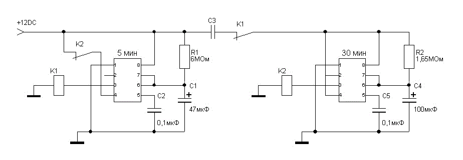 Посмотри в даташит 555, может наоборот на первой микросхеме перепутано ...Да, и на схеме опечатка - выход "30 мин." должен быть с третьей ноги.