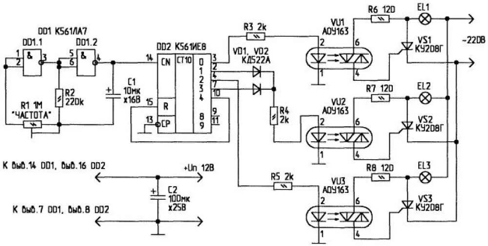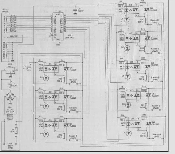 Здравствуйте , у меня возник вопрос как сделать из обычной китайской гирлянды (работающий от ~220B) цветомузыку работающий через lpt порт компьютера . Я уже пробовал подключал к lpt порту 8 диодов , все отлично работало , но как подключить гирлянду чтоб не чего не сгорела не знаю , гирлянда имеет 240 лапочек , которые делятся на 4 цвета по 60 лапочек , выходит что мне надо каждый цвет подключить к 1 каналу lpt порта .