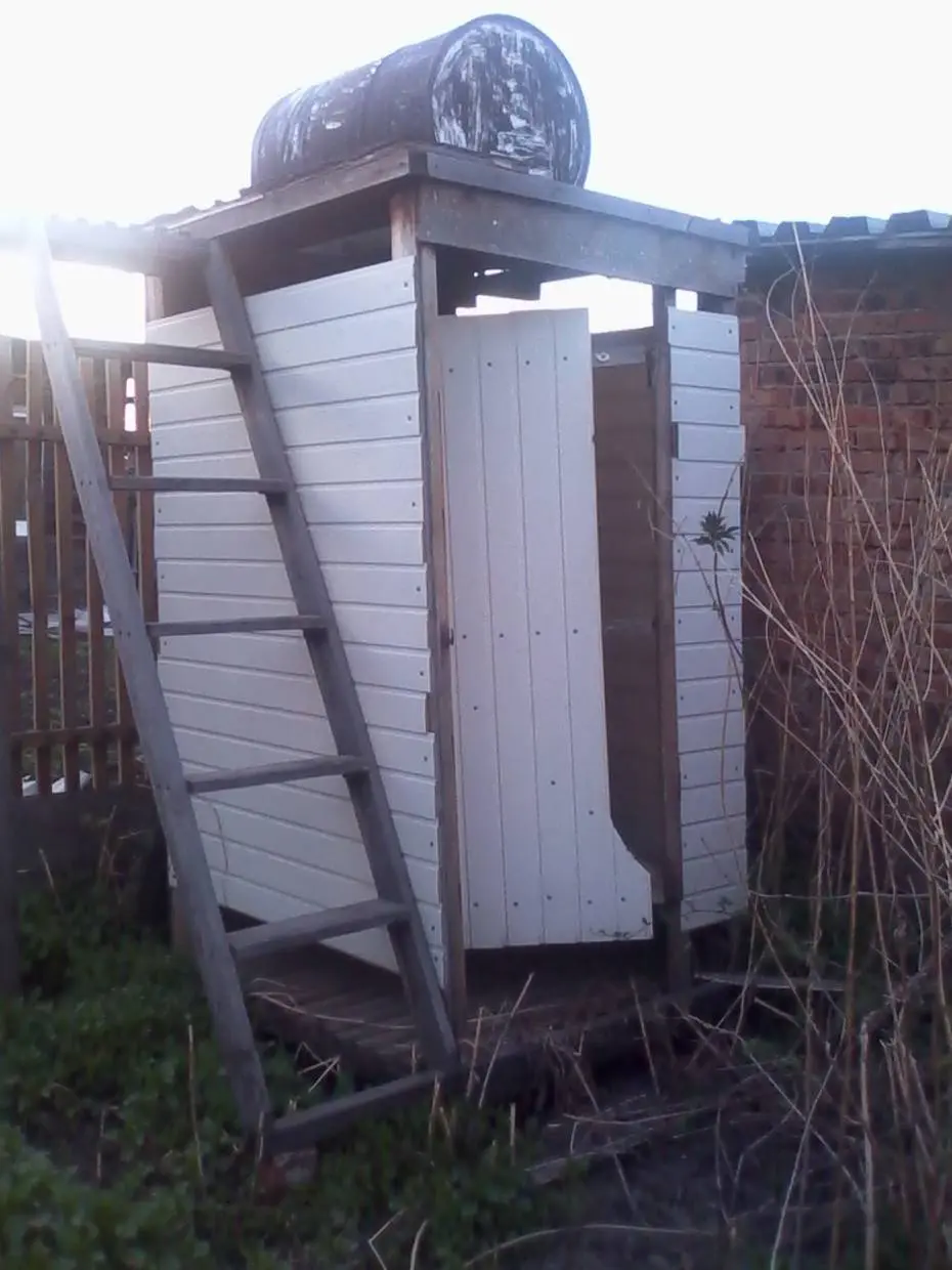 Душ я строил из бруса, обшивал пластиковой вагонкой, низ покрашен кузбасс-лаком и слегка укреплен бетоном. На фото - последствия урагана, сооружению пять лет.
