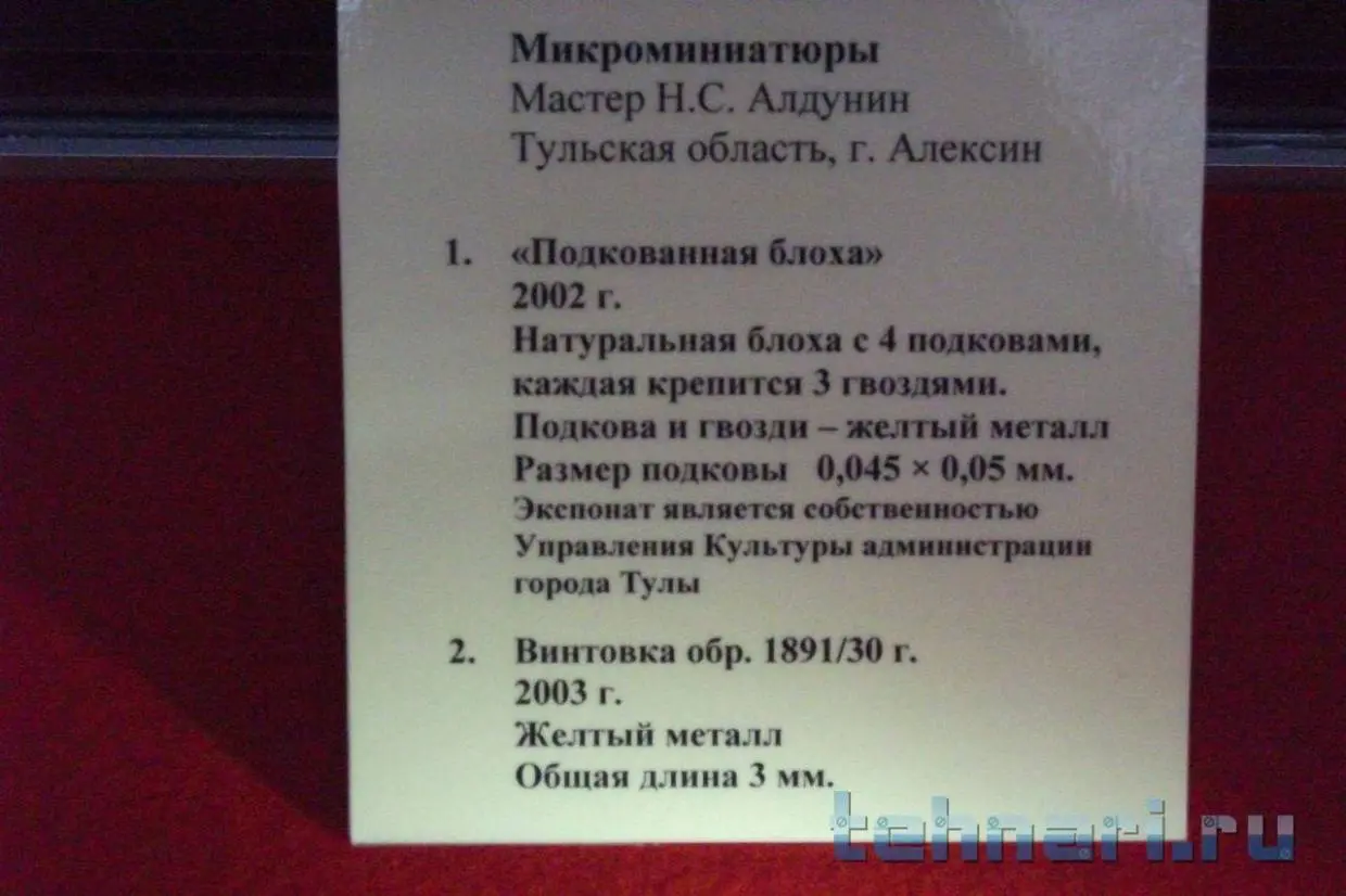 Вот что сказал сам мастер про свою блоху: «Лапки ведь у них пустые внутри, а снаружи волосатые. Сделал на лапках депиляцию, подстриг коготки, так сказать педикюр навел, а потом только приступил к подкове. Я подсчитал, что на одной спичечной головке этих подковок можно уместить две с половиной тысячи штук». На самых кончиках четырех из шести блошинных лапок сверкают золотые подковки. В каждой — по три гвоздика. Одна блошиная подковка Алдунина весит 0,00000004419 грамма. Из одного грамма золота получится 22 629 544 подковки. То есть можно подковать больше 5 миллионов блох. Ширина каждой подковы — 40 микрон, длина — 50, диаметр шляпок гвоздиков — и вовсе 5 (в 1 миллиметре 1000 микрон).