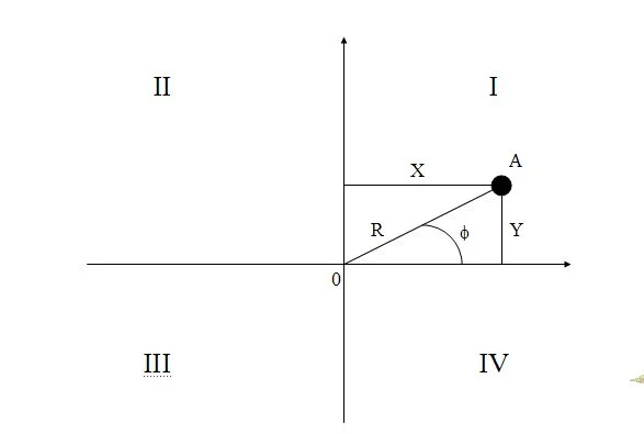 Здесь показана плоскость с проведенными вертикальной и горизонтальной осями, разбивающими её на 4 квадранта (обозначены римскими цифрами). На плоскости имеется точка А. Вначале, для простоты, поместим ее в I квадрант.