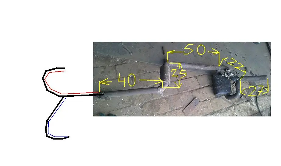Вообщем внутринний диаметр труб на фотографии 36мм , внешний диаметр дорисовенных труб тоже 36 ( внутриннйй примерно 34 ) , длина патрубка по красной линии 70 см , по синей 46см , ну и размеры на фото все в сантиметрах естественно.