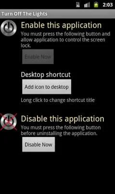 Turn Off The Lights - это мини-приложение, которое выполняет одну единственную функцию - гасит экран вашего аппарата. Тоже самое вы привыкли делать, нажимая на клавишу Power, которая обычно находится на торце аппарата. После установки приложения вы поймете, насколько это было не удобно.