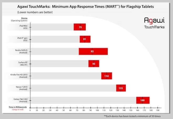 Результаты показали, что самым отзывчивым оказался планшет iPad mini, его задержка составляет всего 75 миллисекунд.