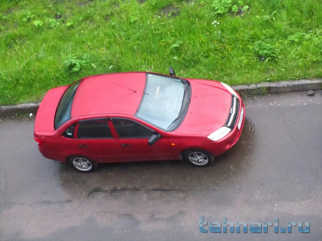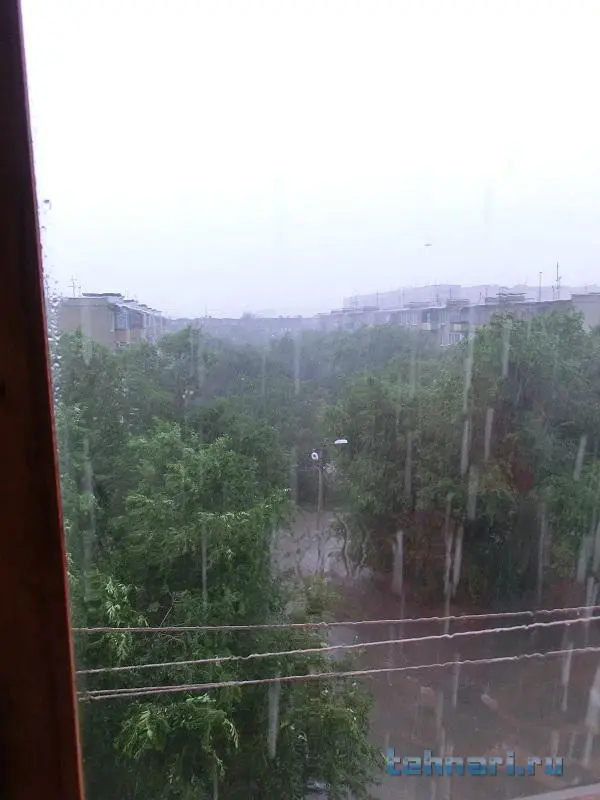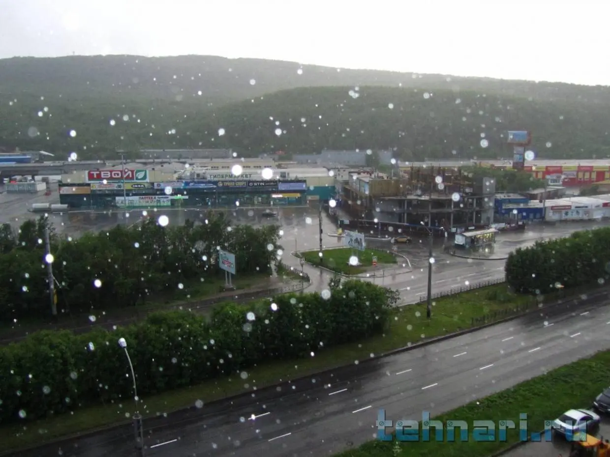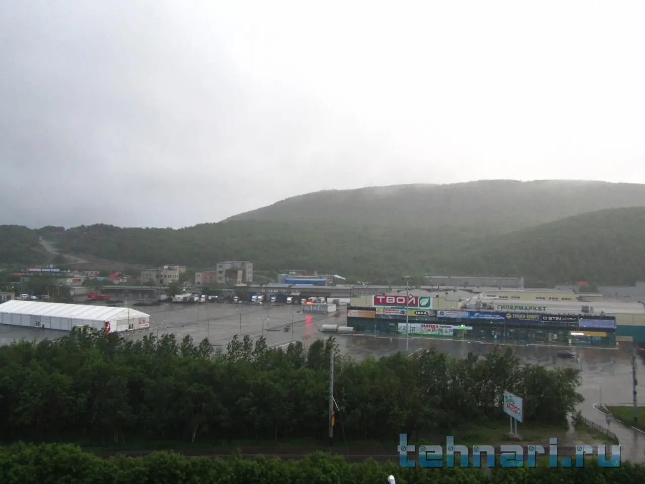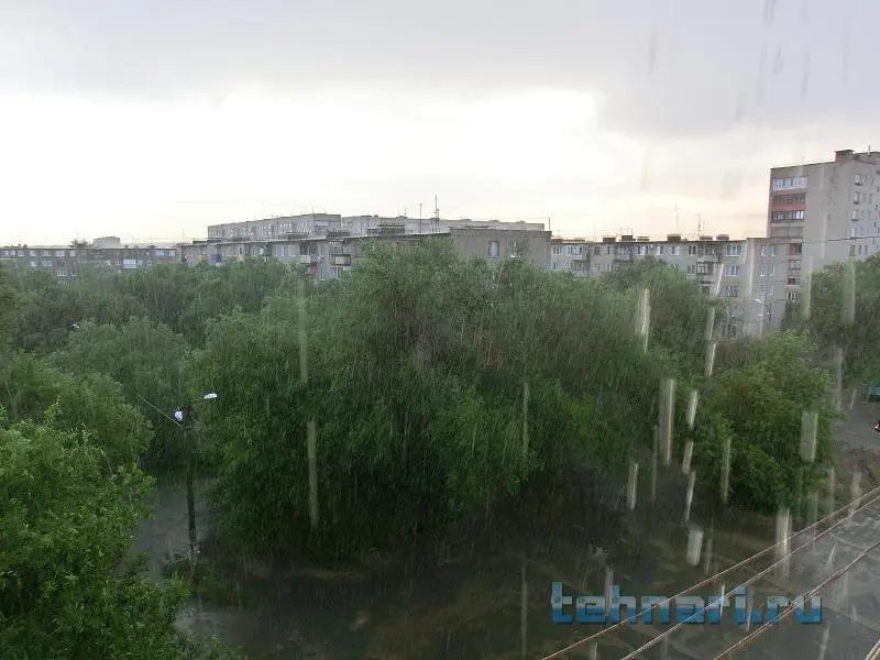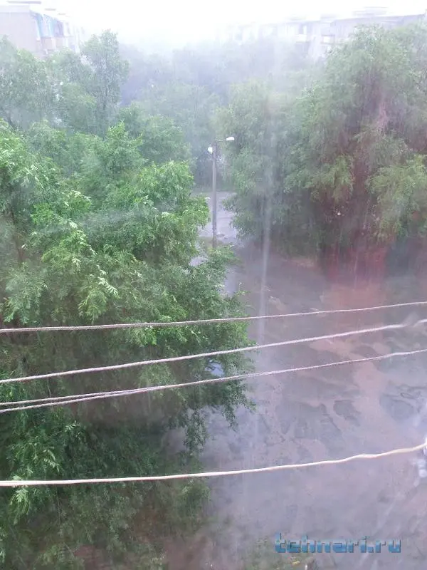 У нас левый берег сухой, правый берег затопило, ливень, +20