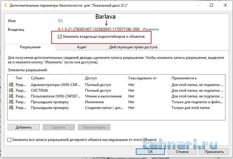 после в поле ниже добавил себя (своя учетка) и "система" у них у все полный доступ, галку на "заменить все записи дочернего объекта..." и применить