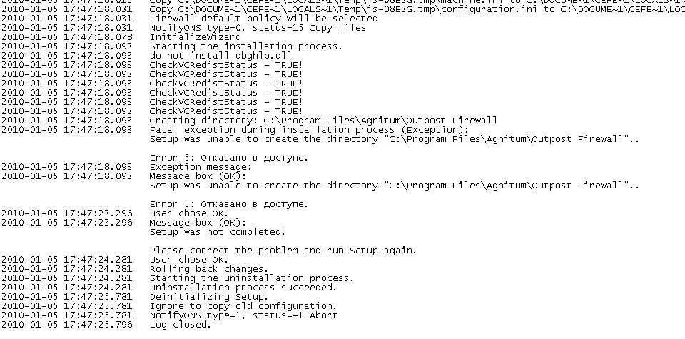 Если возможно, удостоверьтесь, что Вы делаете деинсталляцию и/или инсталляцию с учетной записью, имеющей административные права (касаемо Windows2000 систем и выше). Удостоверьтесь, что Outpost Firewall и Outpost service выгружены перед началом деинсталляции. Это можно сделать через меню Agnitum Outpost Firewall «Файл» - «Выйти и остановить службу» или нажать комбинацию клавиш Alt-X.