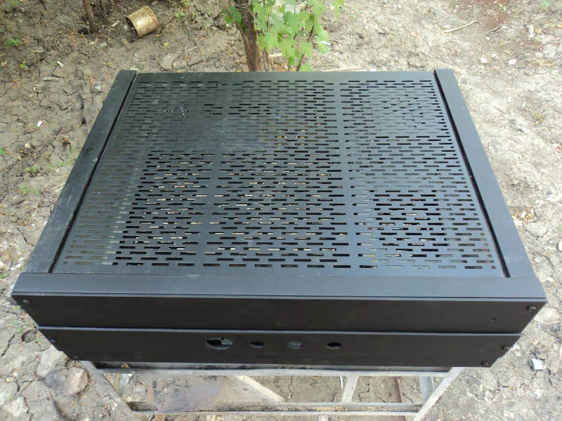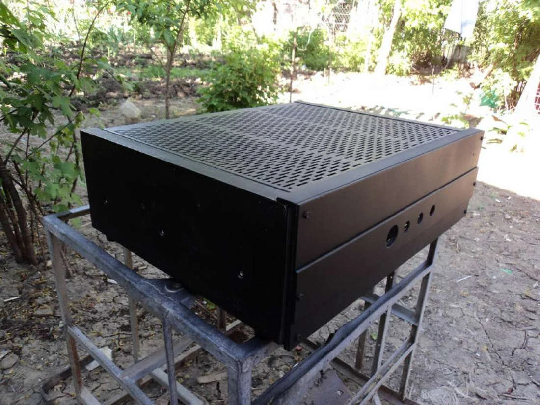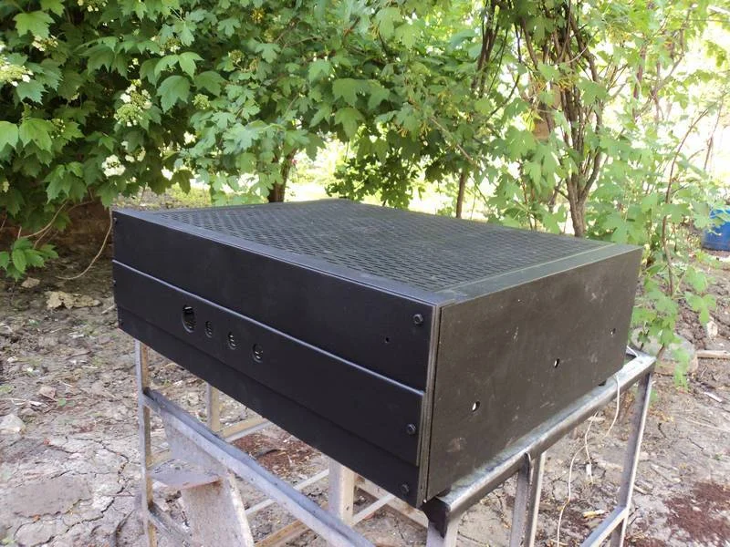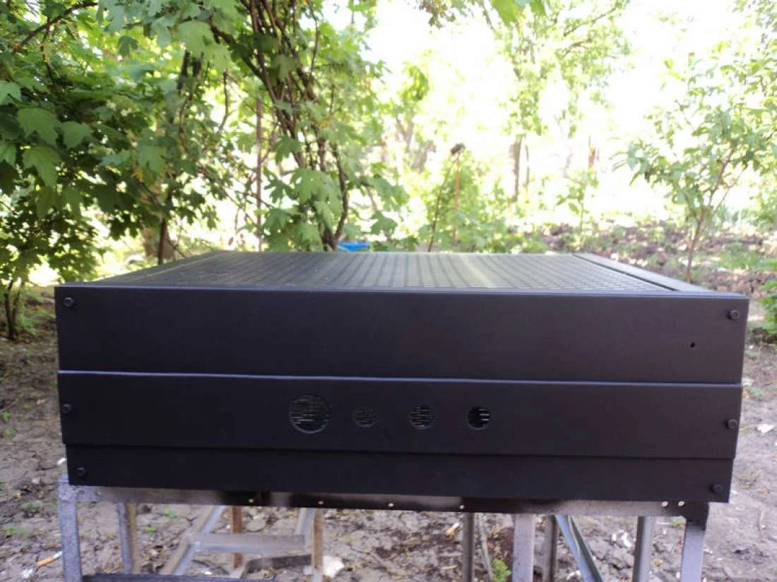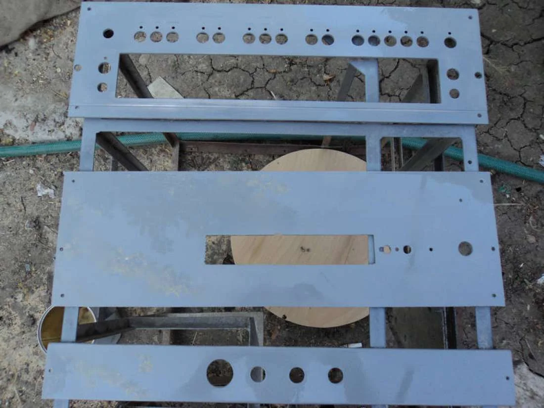 Самая сложная деталь, передняя панель, "лицо" усилителя. Одного чистого (без отверстий) листа алюминия не нашлось, пришлось собирать по кусочкам из того что было. Зачистка, грунтовка, покраска. Без сушилки сохнуть еще долго будет.