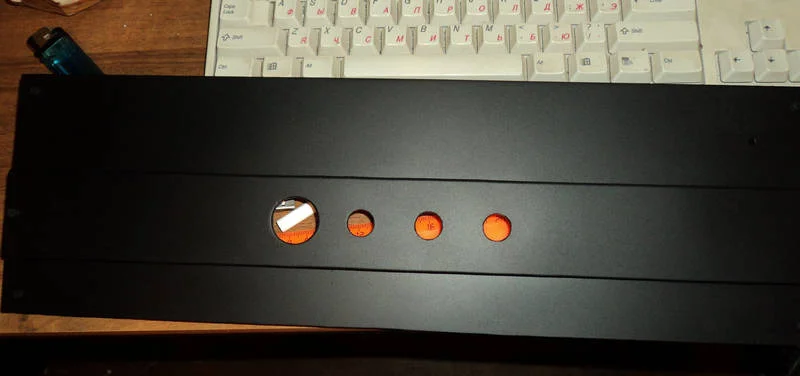 Отверстий стало больше, так как корпус очень просторный, то я решил все организовать в нем. Регулятор громкости, кнопка переключения на наушники, гнездо для наушников, кнопка включения.