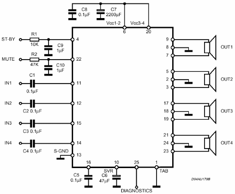 Здравствуйте, недавно нашёл сгоревшую автомагнитолу. Вытащил от туда звуковую микросхему TB2904HQ аналог TDA7386. И решил сделать 4-х канальный усилитель для компьютера. Нашёл схему: tda7386.gif