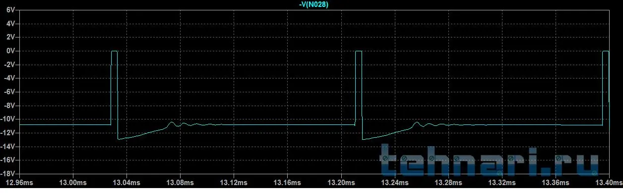 Что- то тут не так. Должен быть выброс за счет тока намагниченности (по площади равен импульсу). Если такого выброса нет, то предположительно: есть КЗ виток, и трансформатор работает исключительно, как резистор, за счет сопротивления первички. Или обрыв первички, а напряжение - за счет обратного тока диода. Тут одно точно, трансформатор не работает.