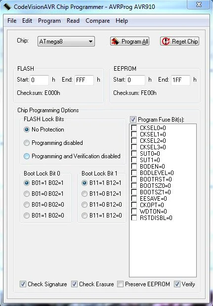Так как программатор Громова не поддерживается PonyProg-ом, то пришлось пользоваться программой Uniprof. Фьюзы выставить как на картинке (Для PonyProg отметить также фьюз SPIEN, а лучше его вообще не трогать)