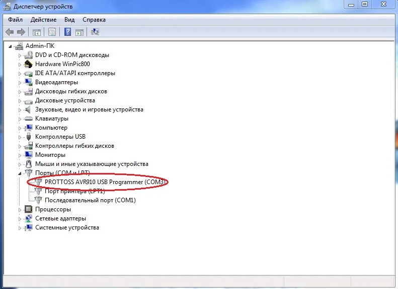 Запускаем программу, переходим во вкладки Settings-Programmer, появляется окно, в котором нужно указать тип программатора и номер виртуального COM порта, узнать который можно, запустив Диспетчер Устройств