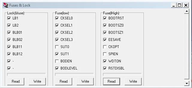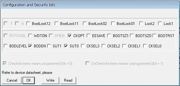 Фьюзы выставляются также, как и в PonyProg. Есть галочка-0, отсутствует-1.