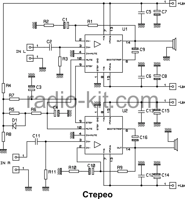 Ну что предложили мне сделать усилок за хорошие деньги стерео на 70 ватт. Буду я его делать на микросхеме tda 7294. пока что не чего нет кроме схемы. Сейчас думаю над корпусом. Буду все подробно описывать, и я надеюсь мне не отрубят интернет прям посреди ворклога(как всегда это происходит). По позже выложу первые наброски на корпус. Вот схема