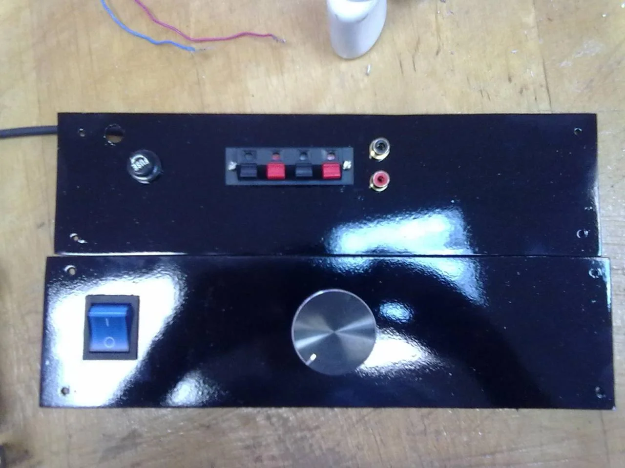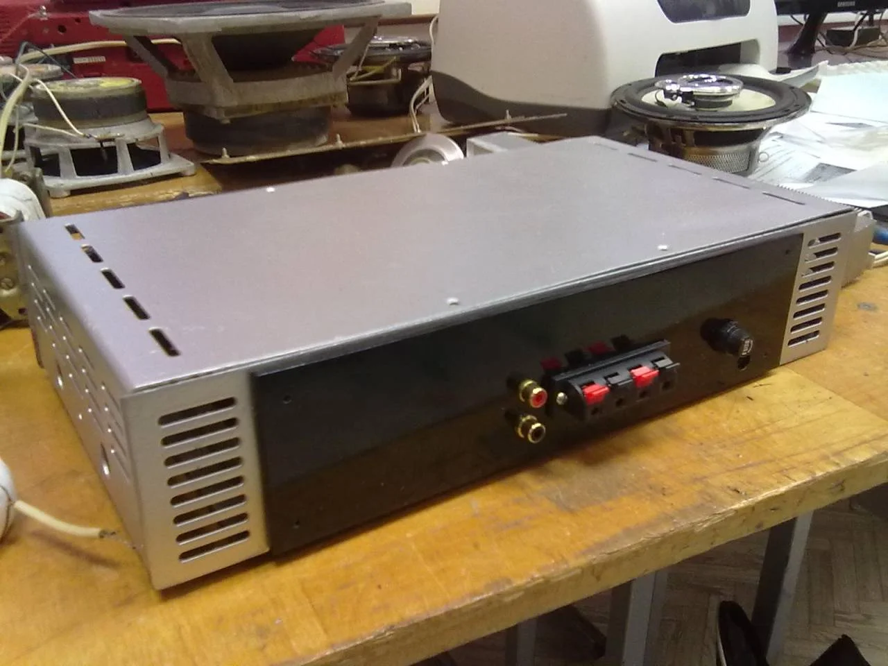 Много я пока ни чего не делал, только вот сделал задюю стенку и переделал переднюю. Теперь регулятор громкости по центру.