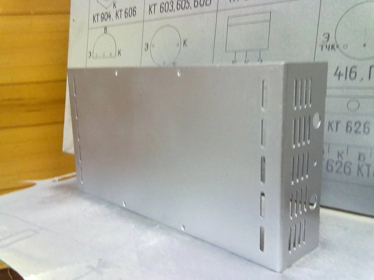Ну что продолжим. Остался мне только корпус. Я решил сделать из алюминия и оргстекла. Из оргстекла будут прикручены накладки на переднюю и заднюю часть корпуса, а остальное все из алюминия. Набросал я на проге будущий корпус и приступил делать. Пока готова накладка на переднюю часть копуса, а на заднюю только в процессе, также уже начал мороки с корпусом. Каркас корпуса я нашел в сарае от какого то устройства (даже не знаю от чего tehno001 ). Каркас уже покрашен, но так как он радио кружке, то у меня есть только фото крышки в процессе краски.