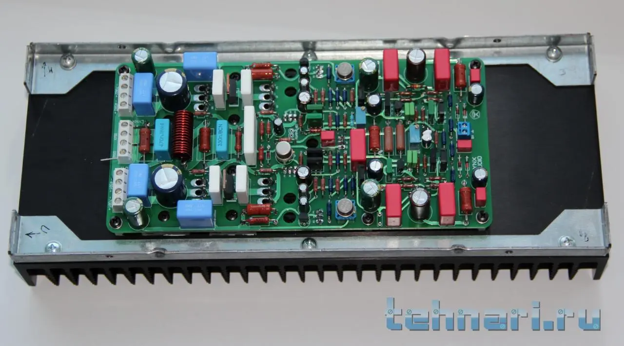 К вопросу о размещении цобеля и выходной катушки. Фото платы УМ на радиаторе последнего усилителя Андронникова Lynx PA76