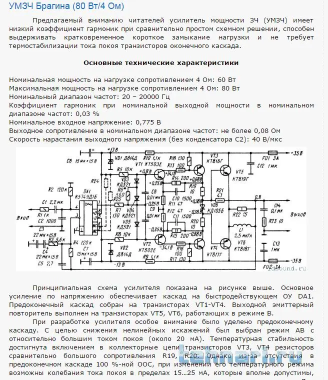 Так у Брагина выход работает а В классе. Зачем оконечники то подбирать? В этом усилителе нужно оказывать большое внимание транзисторам, работающим в предвыходе. От них, в основном, зависит звучание. Это они вытягивают малый сигнал. Вот их нужно подбирать по парам. И желательно поставить что нибудь хорошее. Хотя я собирал на 817 - 816, и тоже , звучало всё очень гуд. Мне вообще нравиться этот усилитель и своим качеством звучания, и своей надёжностью. У меня он до сих пор работает, но только уже на импорте. Я говорю о первом варианте этого усилителя.Оконечники были подобраны по к.у.