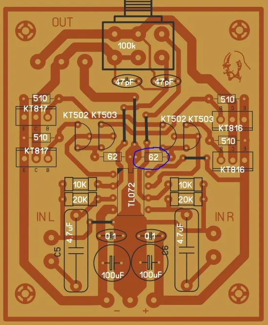 Болею и голова плохо соображает. Не знаю, то ли опять не въезжаю как с резисторами, но на печатке коллекторы выходных транзисторов обоих каналов запараллелены.