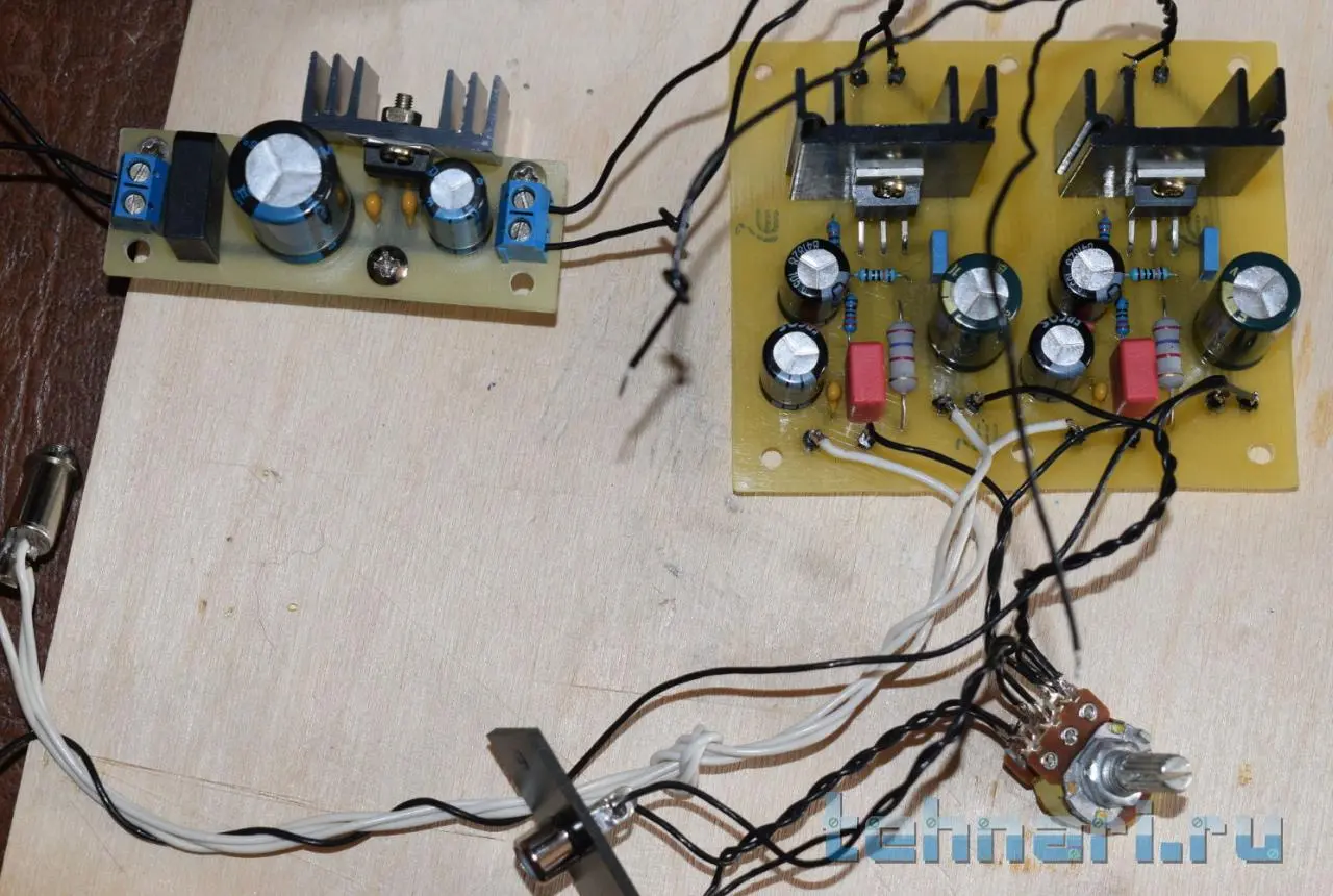 Так вот проблема в том что если включить усилитель с открытым входом, то есть к входу на печати не подключено в обще нечего даже регулятора громкости. Трещит, свистит так что невозможно, при подключении регулятора громкости на проводах окло 30 см треск ещё хуже даже при замыкании входа на землю.