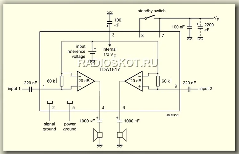 Не обязательно TDA1517P, можно и TDA7050, уши не убьешь ...Тем более приведенной схемой можно и уши убить. По 6 Вт на канал.