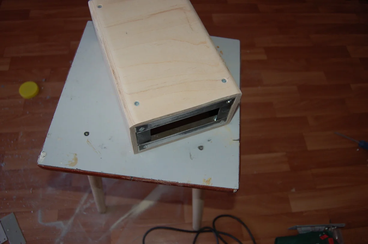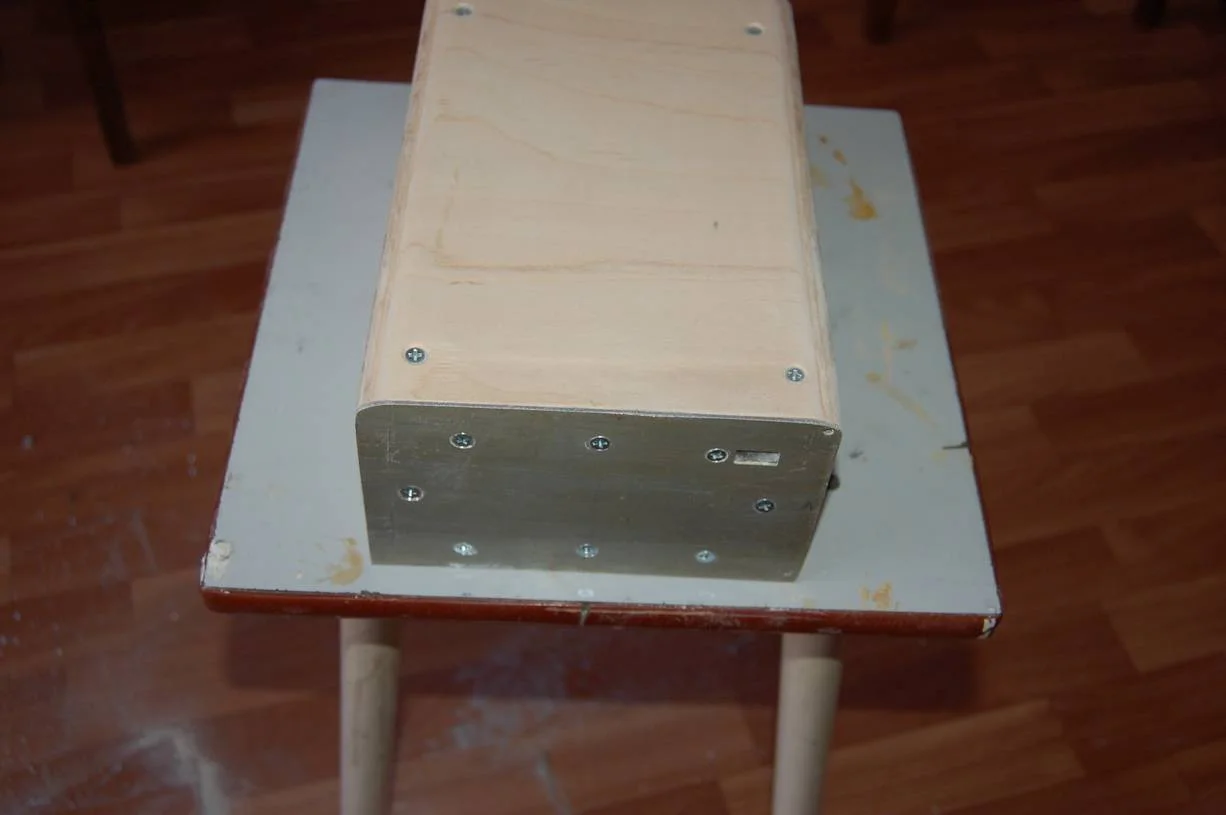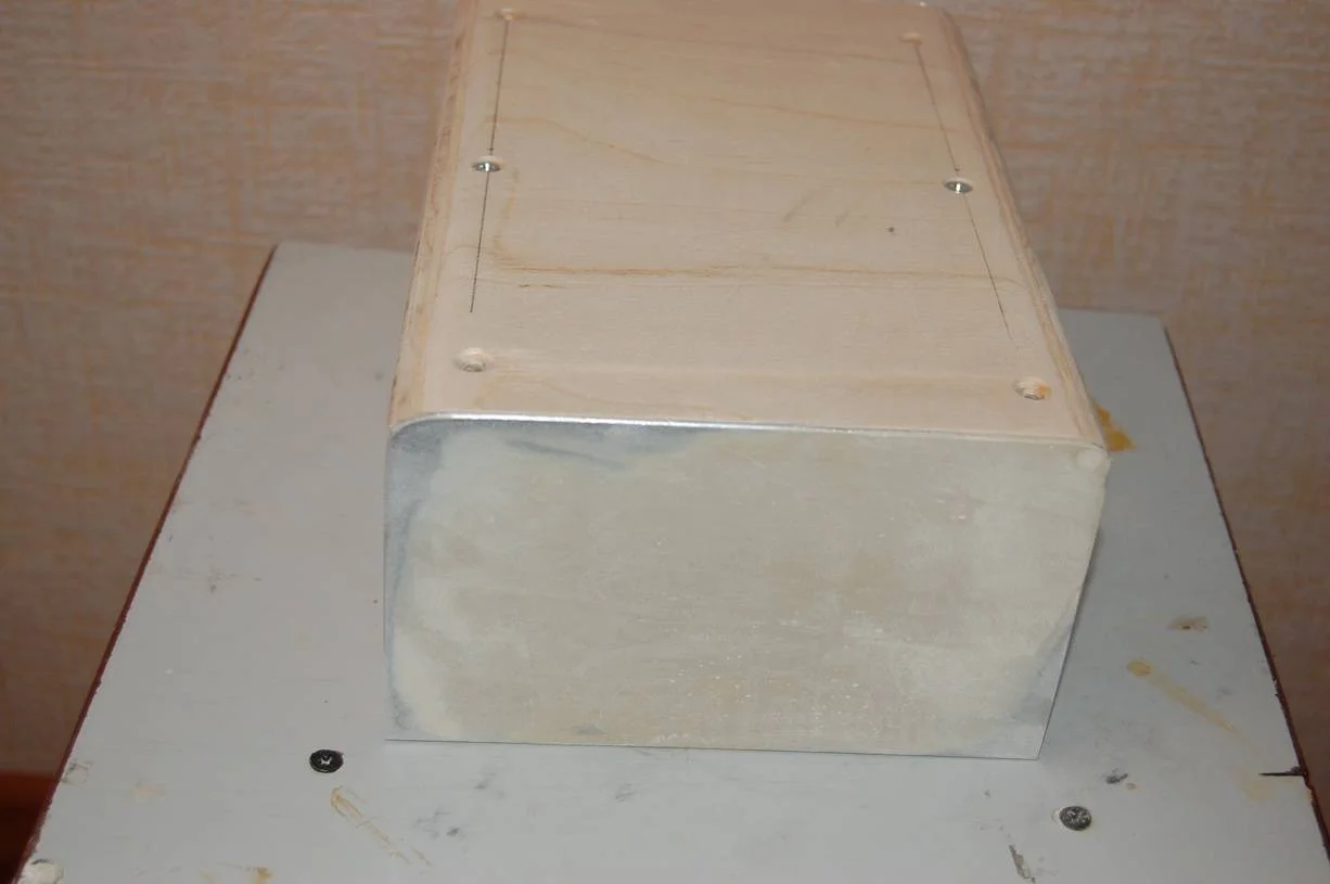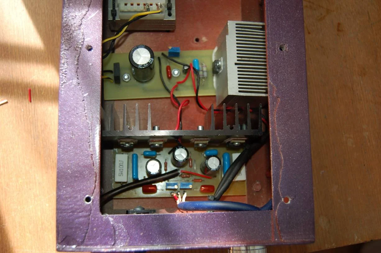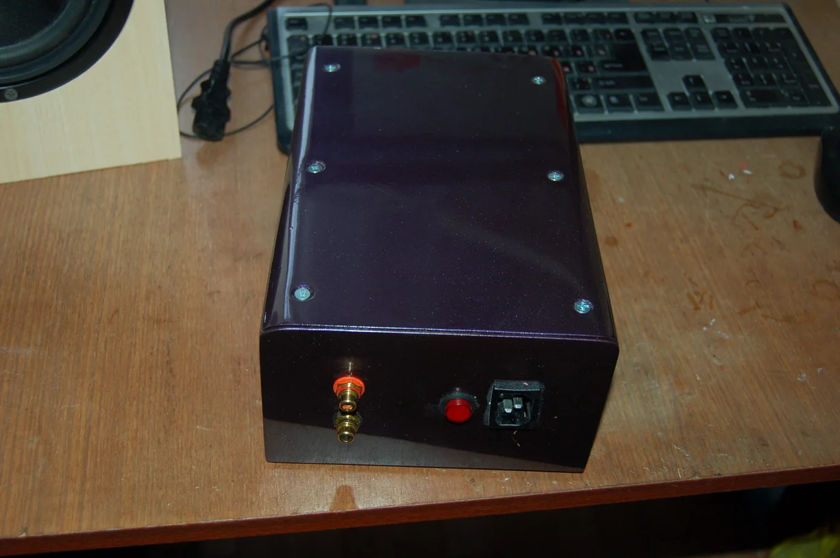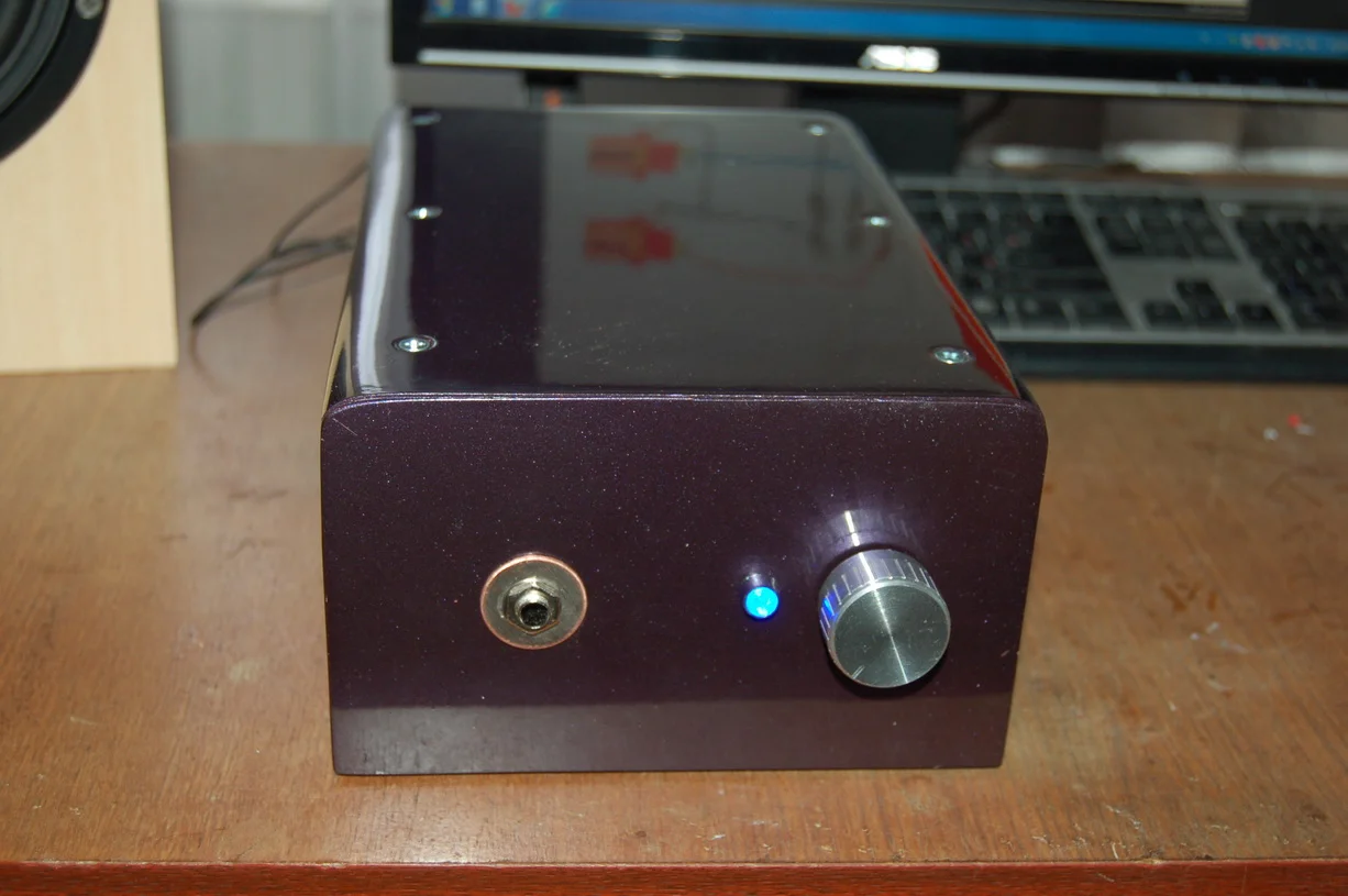 Дальше у меня все по накатанной, шпатлевка, обработка грунтовка, нанесение металлика и лака. Цвет решил взять необычный - сиреневый, супруге такой понравился). После покраски собрал все в корпус , кнопка включения находится на задней панели, спереди только индикатор питания и регулятор громкости. Сам усилитель прост в изготовлении и имеет хорошее звучание, любой способен его повторить.