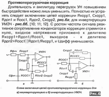 Входной фвч на плате обязан быть,С2 на рисунке стоит,он у меня отключен был при проверке меандром на соотношение усиления каскадов. Выброс убрался пр уменьшении усиления ЛТ .потому и коррекцию снял.Но место под неё надо предусмотреть,оу разные бывает ставят.Тормозилка по сути противоперегрузочная коррекция .Вот отрывок из литературе по этому вопросу