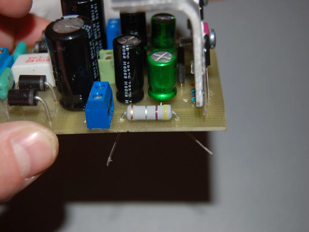 Вынул плату стабилизатора. Выпаял силикатник из центра вместо его поставил перемычку. Дорожки перед выходными клеммами разрезал и поставил такие вот резисторы по 2 Вт 0,47 Ом, других мощных резисторов под рукой пока нет. Отмыл всю плату спиртом.