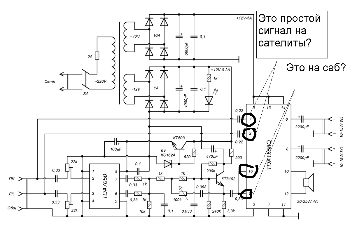 Юрий у меня вопрос по вашей схеме: АС 1.2. Я думаю делать принцыпе также. вот обясните мне пожалуйста 1 вещь. которая не вкладывается в голове. Это как на 1 микре может играть дин от саба только нч и 2 сателита просто играют? Или в микру идет 2 входа? 1 только нч