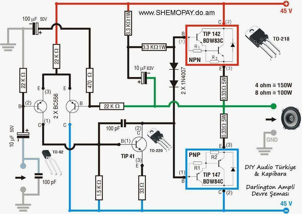 Время в обрез, сразу же взгляд упал на вот эту схему усилителя на 150 ват.