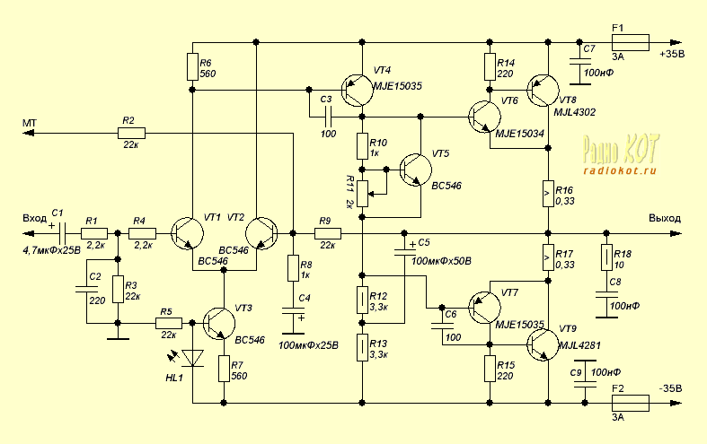Всем доброго времени суток,нашёл на просторах интернета данную схему Унч,сайт иностранный,так что дословно перевелось,а вот подробно не понять что к чему,вопрос-какие выходные транзисторы можно в него поставить,кт819,818 пойдут,питание будет в раене +-30вольт,как он по стабильности и качеству?