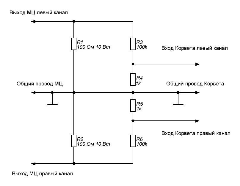 Здесь Корвет точно также был подключен к выходу усилителя мощности музыкального центра. Поэтому не парьтесь и подключайте Корвет к выходу нового музыкального центра через резистивный делитель, если раньше звук устраивал.