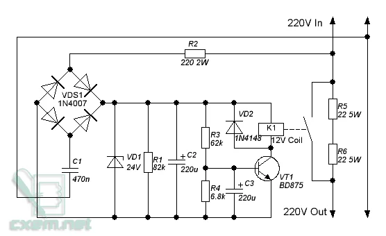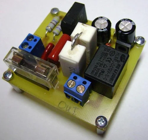 Схема плавного пуска обеспечивает задержку около 2-х секунд, что позволяет плавно зарядить конденсаторы большей емкости без скачков напряжения и моргания лампочки дома. Ток заряда ограничен величиной: I=220/R5+R6+Rt.