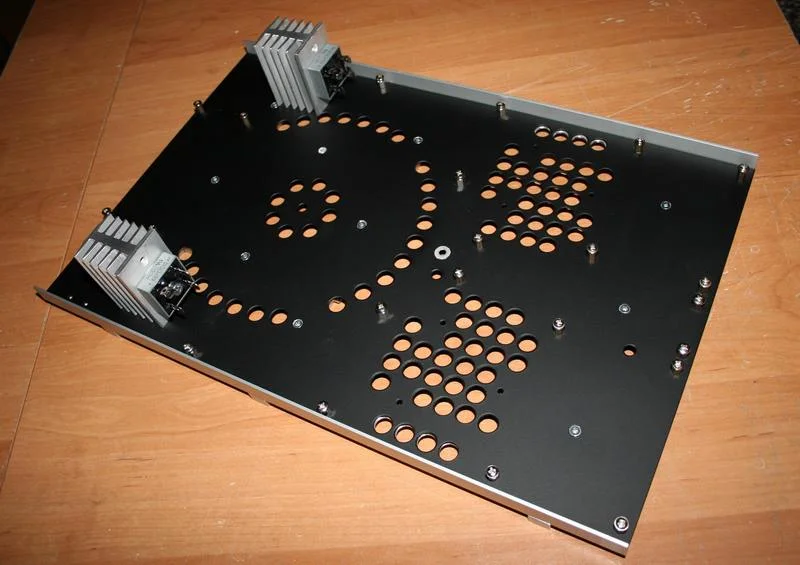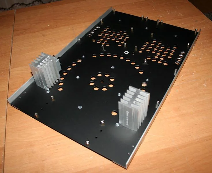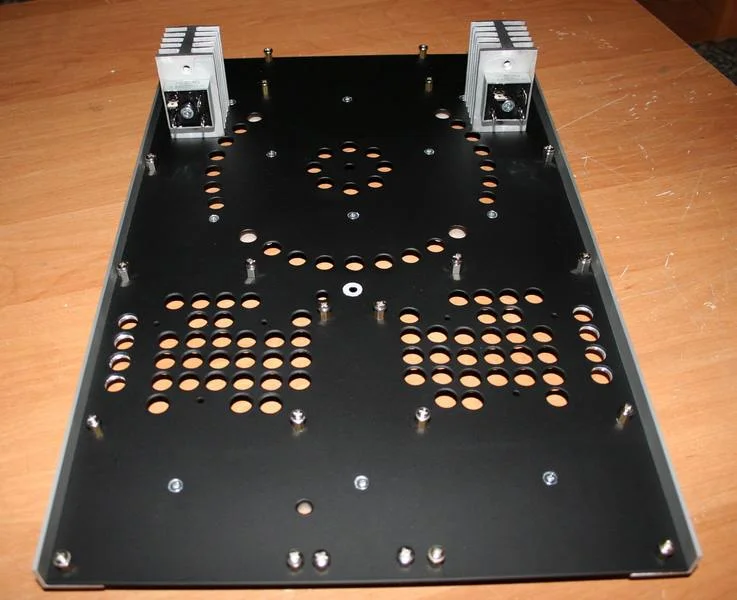Сегодня доделал шасси. Покрасил, установил стойки крепления плат и радиаторы выпрямителей. Радиаторы усилителей поставлю попозже, нужно будет уточнить места отверстий под транзисторы.