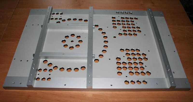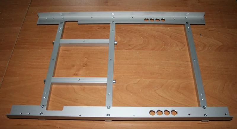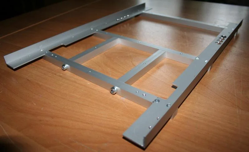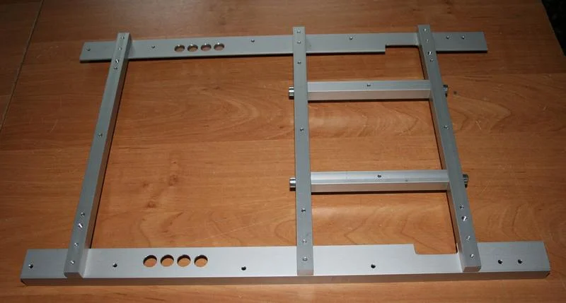 Почти собрал шасси, осталось уточнить места отверстий для крепления платы защиты, и наверное, покрашу. Шасси сделал из дюралевого проката и дюралевого же листа.