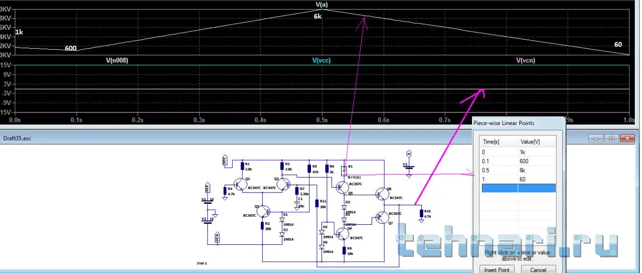 Изначально режим у верхнего транзистора q6 в микрокапе стоял режим off, после изменения сопротивления R7 он поменялся на LIN(рабочий режим).