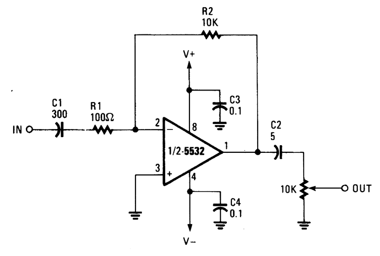 резисторами R2:R1 задаётся коэффициент усиления,для тебя будет достаточно заменить R1 на 1к,а R2 поставить на 4.7к,конденсатор С1 емкостью 0.33-0.68мкф(плёнка),С5 лучше плёнку на 2.2-4.7мкф(напряжение роли не играет).