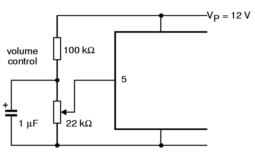 Особенность этой микросхемы в том, что в ней есть встроенный регулятор громкости. 2 вывод - плюс питания, 4 и 7 выводы - минус питания, 3 - вход, 6 и 8 - выход, подключаются динамики. К 5 выводу подключается регулятор громкости.