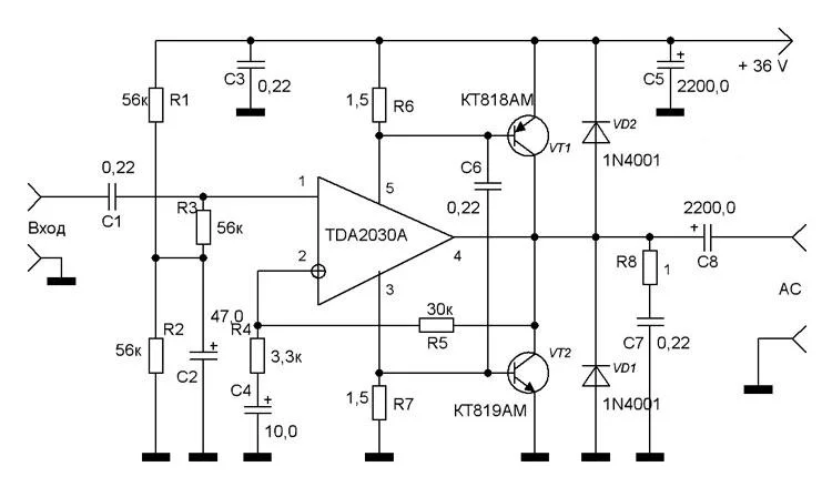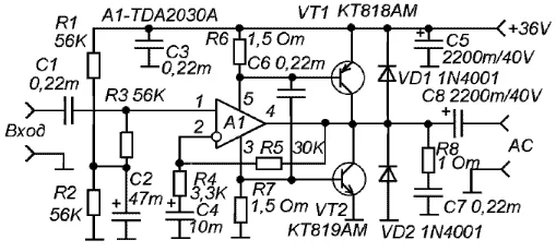 Усилитель собран на микросхеме TDA2030A, и двух транзисторах КТ818 и КТ819. На рисунке ниже показана схема усиления для одного канала.