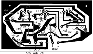 Печатная плата усилителя звуковой частоты сделана на фольгированном текстолите. На плате стоят две перемычки.
