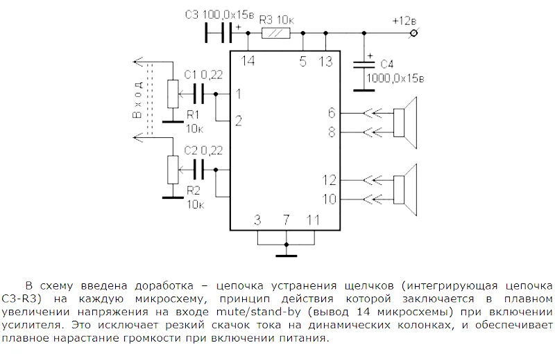 Подкажите куда надо поставить резистор и конденсотор чтоб небыло щелчка при включении усилителя а то я гдето нашел инфу купил детали и потерял место где это было описано!