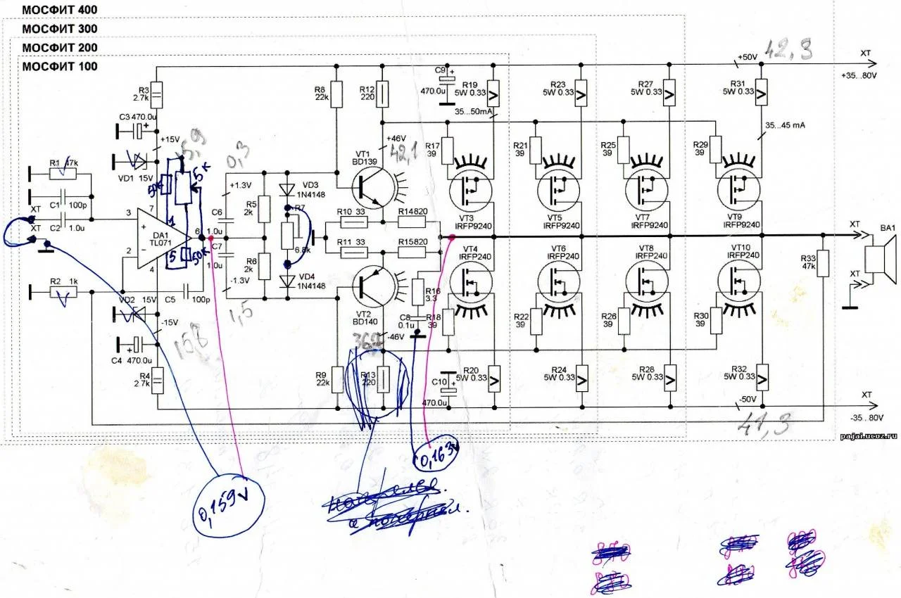 агрегат впаяй на 1 и 5 ногу ТЛ071 а регулировочную жилу на 4-ю (минус) ногу (а не 6-ю, как у тебя) (предварительно выставив одинаковое сопротивление на обоих плечах), внимательней читай сообщения!, а уже подстраивая- добиваешься ноля в точках что ты указал (показания желательно уменьшить- подрегулировать- этого много! желательно где-то в раёне 5микровольт (можно и меньше...))