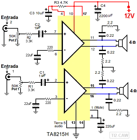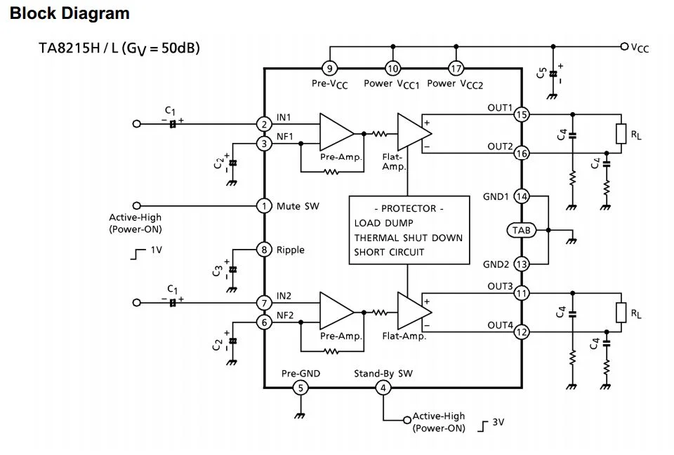 Можно и по плате разобраться, используя принципиальную схему. Подключить 4 динамика, подать питание, подключить выводы Mute и Stand By к плюсу питания, а потом просто прощупать все входы...
